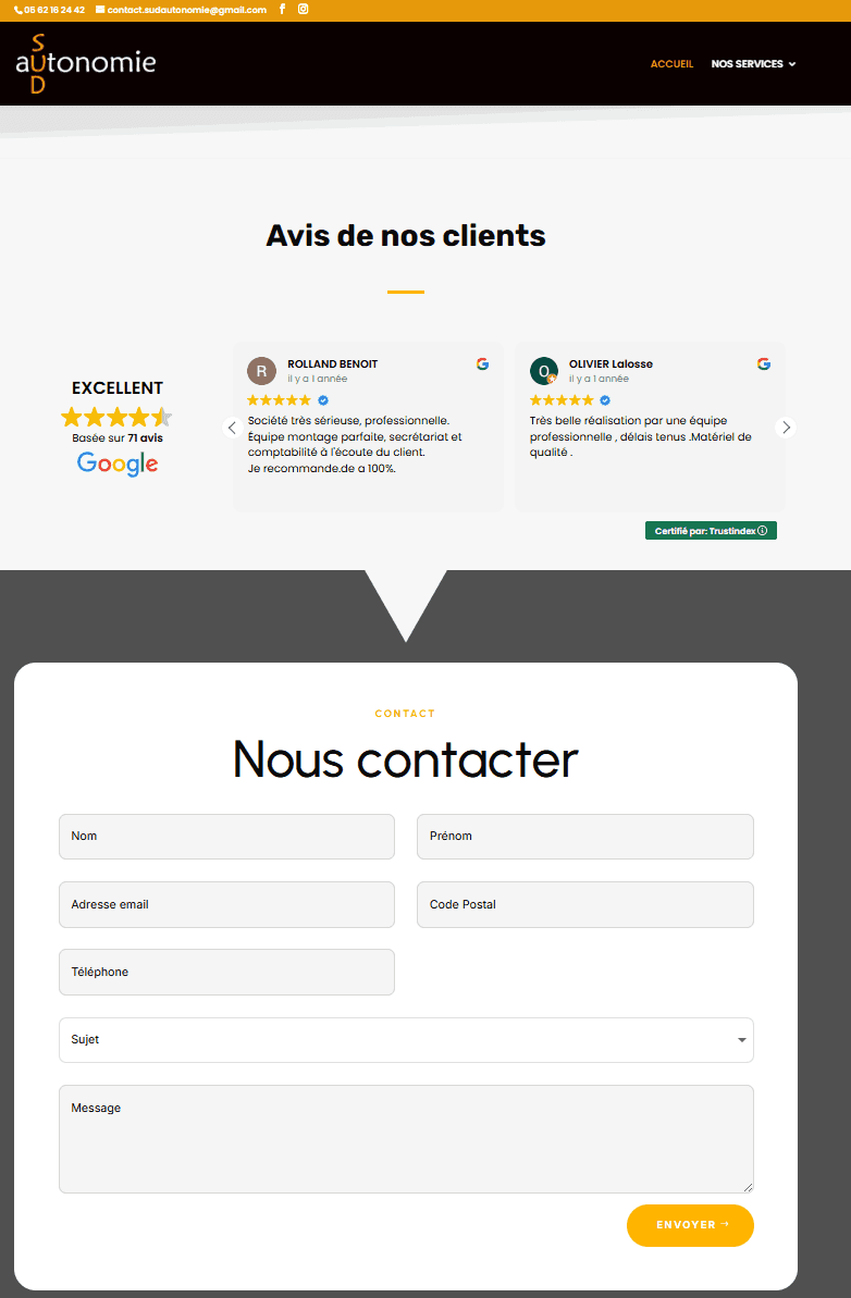 Sud Autonomie souhaitait moderniser son image en ligne avec un site plus clair, plus professionnel et plus rassurant. L’objectif était de mieux présenter l’activité et surtout de faciliter les actions principales des visiteurs : prises de contact, demandes de devis et prise de rendez-vous. Le site devait également être plus simple à parcourir, avec une navigation fluide et une hiérarchie d’informations plus efficace.
